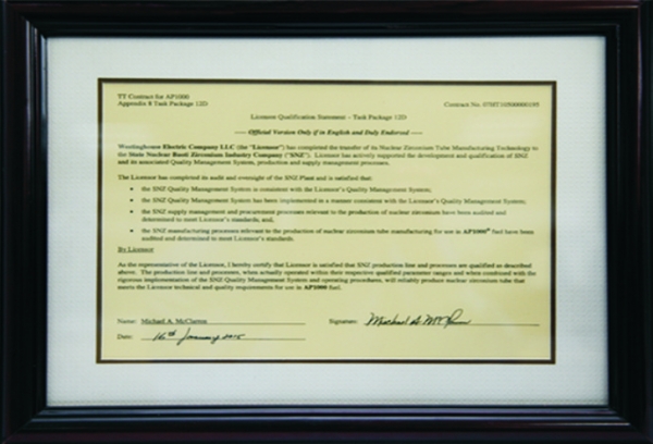 國核鋯業(yè)獲得西屋電氣公司頒發(fā)的AP1000核級鋯材生產(chǎn)線鑒定證書
