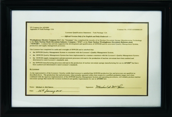 國(guó)核鋯業(yè)獲得西屋電氣公司頒發(fā)的AP1000核級(jí)鋯材生產(chǎn)線鑒定證書(shū)