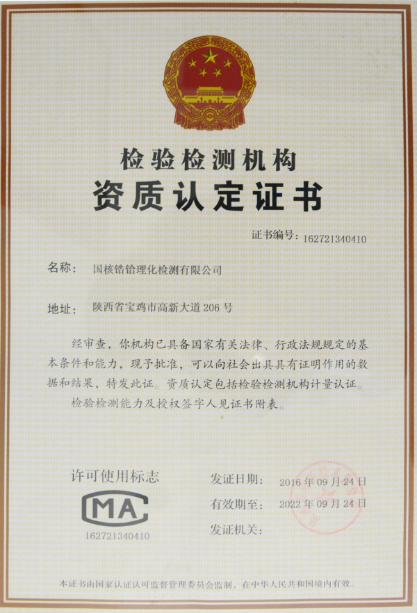 國(guó)核鋯業(yè)所屬?lài)?guó)核鋯鉿理化檢測(cè)有限公司檢驗(yàn)檢測(cè)機(jī)構(gòu)資質(zhì)認(rèn)定證書(shū)