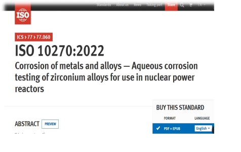 2月9日,由國核鋯業(yè)主導制修訂的國際標準ISO10270:2022《金屬和合金腐蝕-核反應堆用鋯合金水溶液腐蝕試驗》由國際標準化組織(ISO)正式發(fā)布。該標準是我國核電用鋯材檢測領域首個正式發(fā)布的ISO國際標準,實現(xiàn)了歷史性突破,對推動我國和國際核級鋯材材料和評價水平整體發(fā)展及核材料檢驗技術提升具有重大意義。
