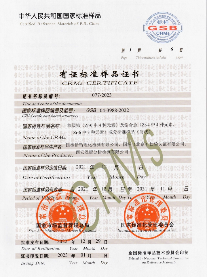 2月27日,理化檢測收到由國家市場監督管理總局和國家標準化管理委員會簽發的標準樣品證書。該標準樣品由國核鋯業理化檢測主導研制,經全國有色金屬標準樣品鑒定會評審鑒定,是國內首個獲批的核級鋯及鋯合金標準樣品,打破了我國核級鋯材檢測溯源、監控長期依賴進口的局面。
